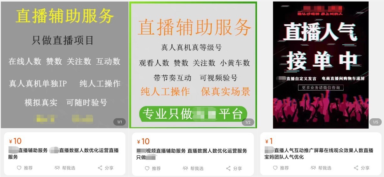 目前,在电商平台搜索关键词,也可以发现投机分子打着“直播数据优化”的旗号,提供流量造假服务。在线人数、点赞数、关注数、互动数,“您需要的效果,我们给您解决”。